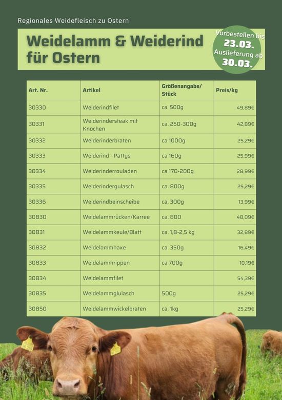Wenn du für die Ostertage Lammkeule, Lammkoteletts, Braten oder Steaks auf dem Tisch haben möchtest, kannst du noch bis Montag vorbestellen.