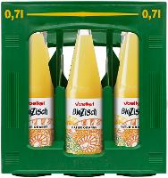 Natürliches Mineralwasser, Orangensaft* 6%, Rohrohrzucker*, Orangenfruchtmark* 3%, Zitronensaftkonzentrat*, Traubensaftkonzentrat*, Orangenöl*, Quellkohlensäure.| Energie | Fett | gesättigte Fettsäuren | Kohlenhydrate | Zucker | Ballaststoffe | Eiweiss | Salz |