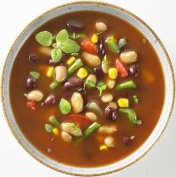Trinkwasser, 11% Kidneybohnen*, 11% weiße Bohnen*, 8,2% grüne Bohnen*, 7,6% Paprika*, Zwiebeln*, 3,1% Mais*, Tomatenmark*, WEIZENMEHL*, Sonnenblumenöl*, Steinsalz, Maltodextrin*, Rohrohrzucker*, Meersalz, Karotten*, Maisstärke*, Gewürze* (Knoblauch*, Muskat*, Curcuma*, Pfeffer*, Paprika*, Chili*), Kräuter* (Liebstöckel*, Oregano*, Basilikum*, Rosmarin*, Thymian*, Petersilie*).| Energie | Fett | gesättigte Fettsäuren | Kohlenhydrate | Zucker | Ballaststoffe | Eiweiss | Salz |