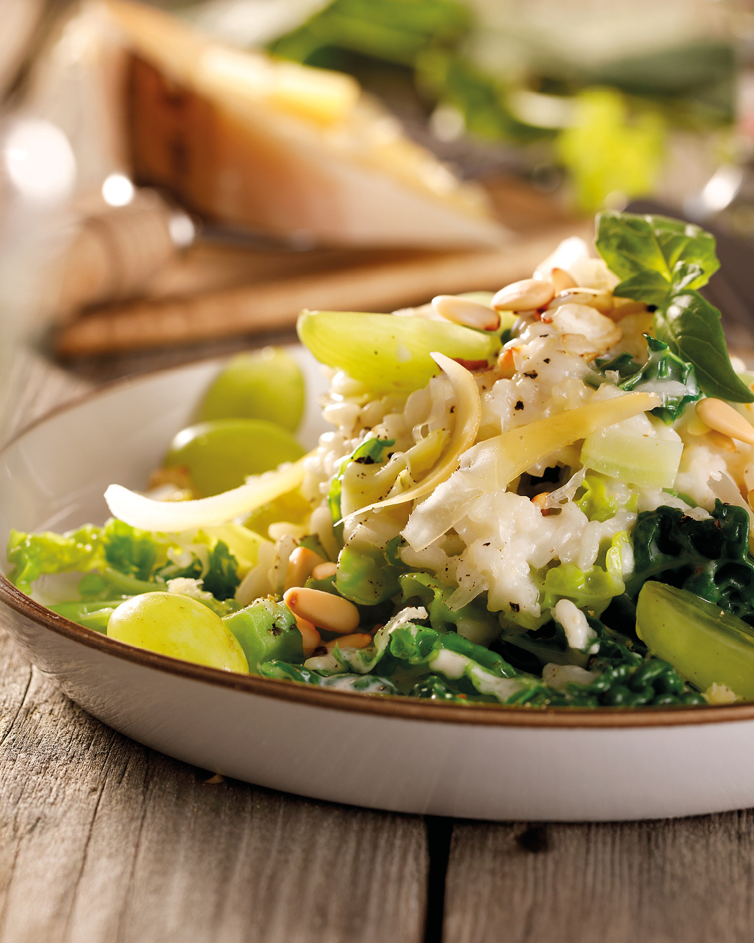 Eine Schalotte würfeln und in einem Topf in etwas Olivenöl anschwitzen. Die Knoblauchzehen hacken und kurz mit durchziehen. Den Reis dazugeben und kurz mit anschwitzen. Mit Weißwein aufgießen und diesen einkochen lassen. In der Zwischenzeit die Pinienkerne goldbraun anrösten. Nach und nach den heißen Gemüsefond dazugeben. Immer wieder einkochen lassen und ständig rühren. Zwischendurch mit Salz und Pfeffer würzen. Zuletzt die Butter und den Gouda unterrühren. Den Wirsing und die zweite Schalotte in feine Streifen schneiden. Die Schalotte in etwas Olivenöl anbraten, den Wirsing dazugeben und in der Pfanne fertig garen. Die Weintrauben halbieren, dazugeben und kurz erhitzen. Den Wirsing auf das Risotto geben, mit den gerösteten Pinienkernen bestreuen – fertig
