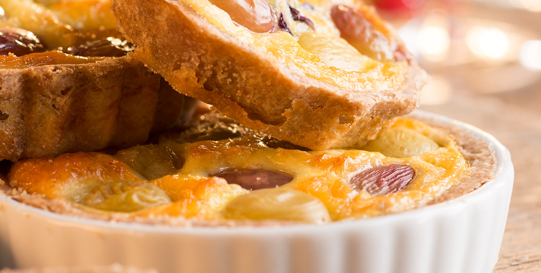 Die Butter in kleine Würfel schneiden und mit den übrigen Zutaten schnell zu einem glatten Teig verarbeiten. In Folie einschlagen und ca. ½ Stunde im Kühlschrank ruhen lassen. Anschließend ausrollen. Eine große Quicheform einfetten und mit dem Teig auskleiden. Die gehackten Zwiebeln in einer Pfanne in etwas Öl glasig dünsten und anschließend mit den Trauben auf den Quicheteig geben. Crème fraîche, Milch und Eier miteinander verrühren und mit den Gewürzen abschmecken. Den Käse raspeln und die Quiche damit bestreuen. Im Backofen ca. 30 – 40 Minuten bei 165 °C goldbraun backen.