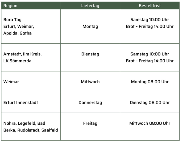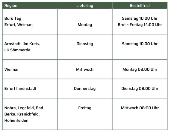 Wir liefern Deinen Biokorb zu regelmäßigen Zeiten aus. Die Tourenplanung ist an feste Wochentage ausgerichtet. Das Zeitfenster ist jeweils zwischen 09:00 und 18:00 Uhr, aufgrund der unterschiedlichen Zusammenstellung der Tour können wir leider keine genauere Uhrzeit festlegen. Bitte nutze daher die Abstellerlaubnis im Bestellprozess.